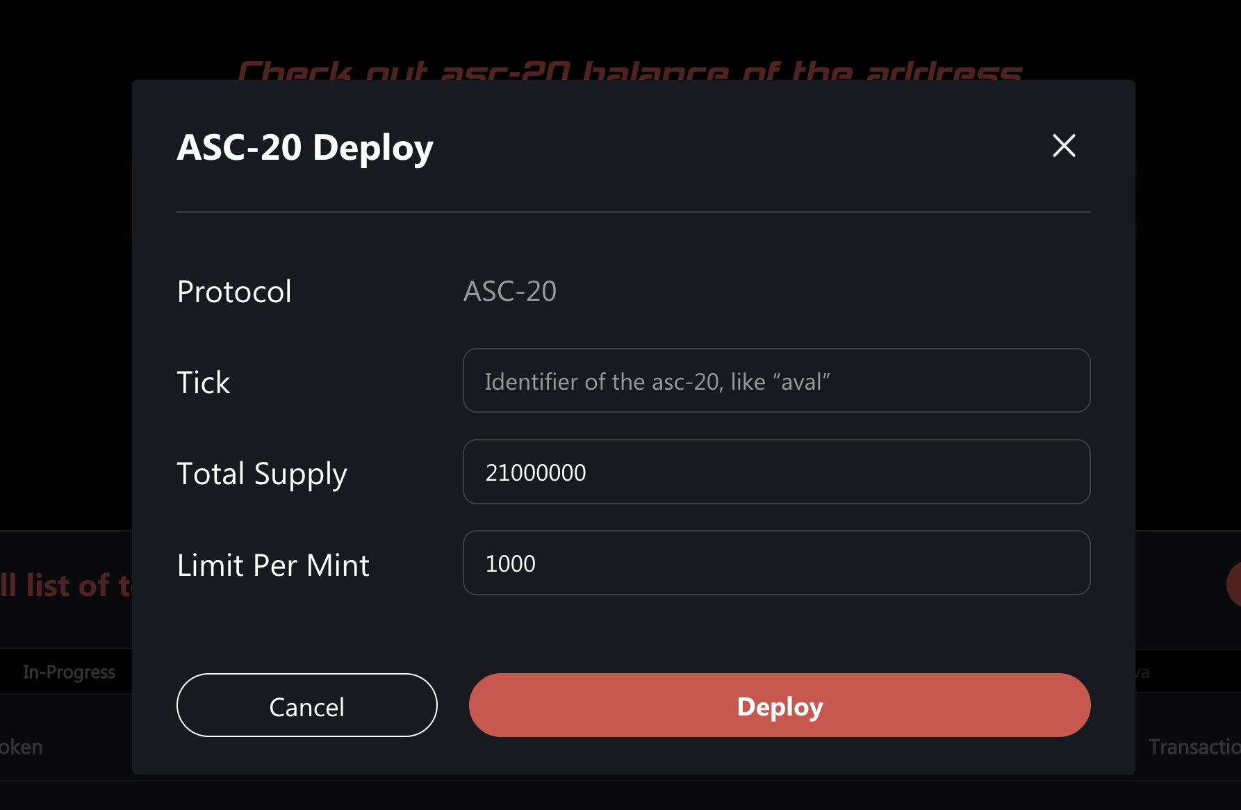### Fill in data : Tick, Total supply, Limit  to complete deployment